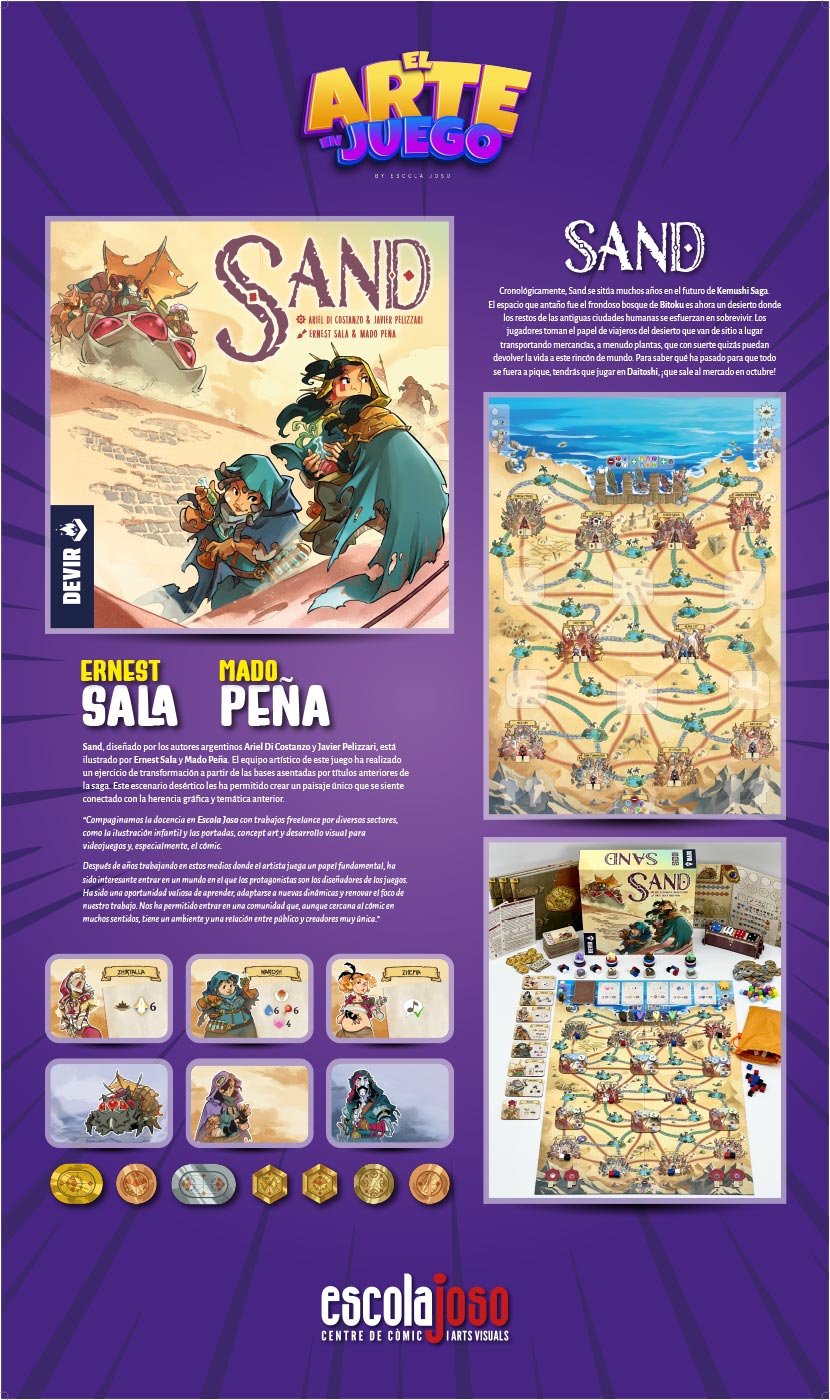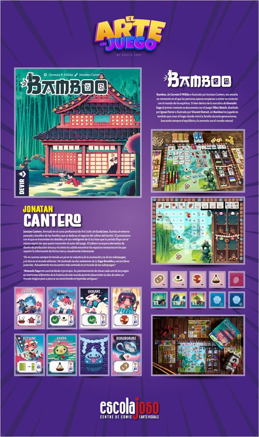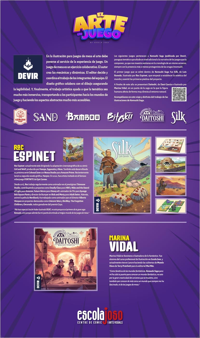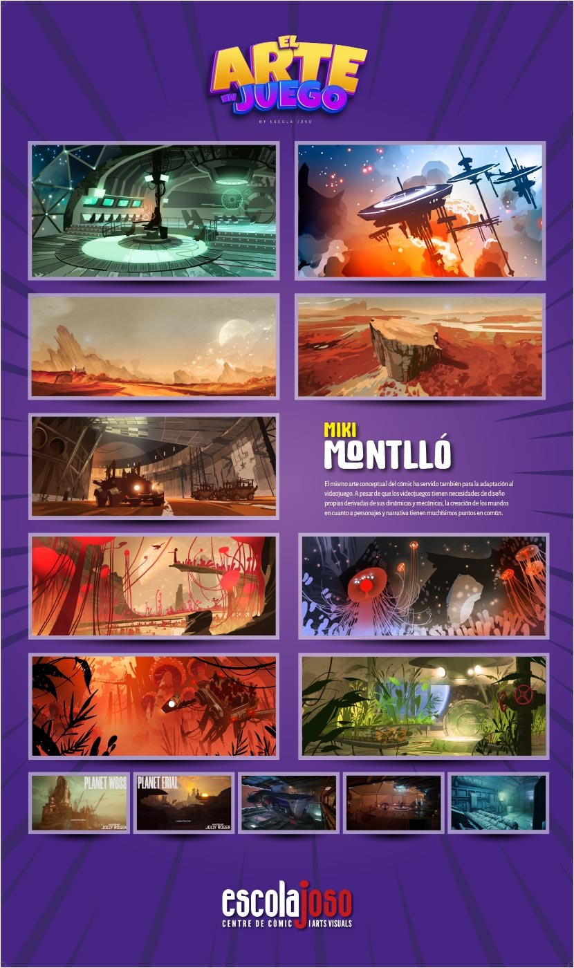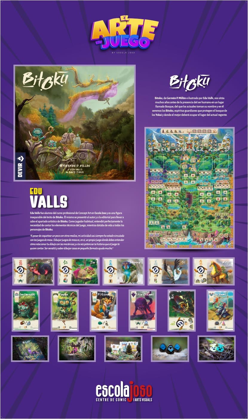 El trabajo de ilustradores y artistas conceptuales que desarrollan juegos de mesa y videojuegos suele ser el primer punto de contacto con sus futuros jugadores, pero es también el encargado de crear y establecer una dirección artística, que sirve como guía visual al resto de equipos creativos. Y, tras todo ese proceso, el arte es parte fundamental del último envoltorio con el que disfrutar de sus mecánicas y narrativas lúdicas. Sin los creadores y diseñadores de juegos estos no existirían, y vaya para ellos nuestro primer homenaje, pero el arte es parte fundamental para definir su identidad. El diseño de mundos, paisajes, lugares y personajes que se entrelazan con las mecánicas de juego ha creado un nuevo terreno donde el arte puede explorar nuevos límites y fronteras. El diseño, la ilustración y la narrativa se entrelazan para poner al servicio del juego no solo la capacidad para representar esos mundos imaginados, sino que también la capacidad de comunicar ideas, emociones y conceptos de lo más abstractos relacionados con la jugabilidad, yendo más allá del mero relato de una historia. En un momento en que hay quien dice que la tecnología puede poner en riesgo el papel que juegan los artistas en estos procesos creativos, queremos homenajear a todos aquellos que dedican su arte a las narrativas lúdicas, destacando el trabajo de algunos de estos creadores que pasaron por las aulas de Escola Joso. Nuestro más sincero agradecimiento a todos los autores y compañías que nos han permitido realizar este homenaje.
