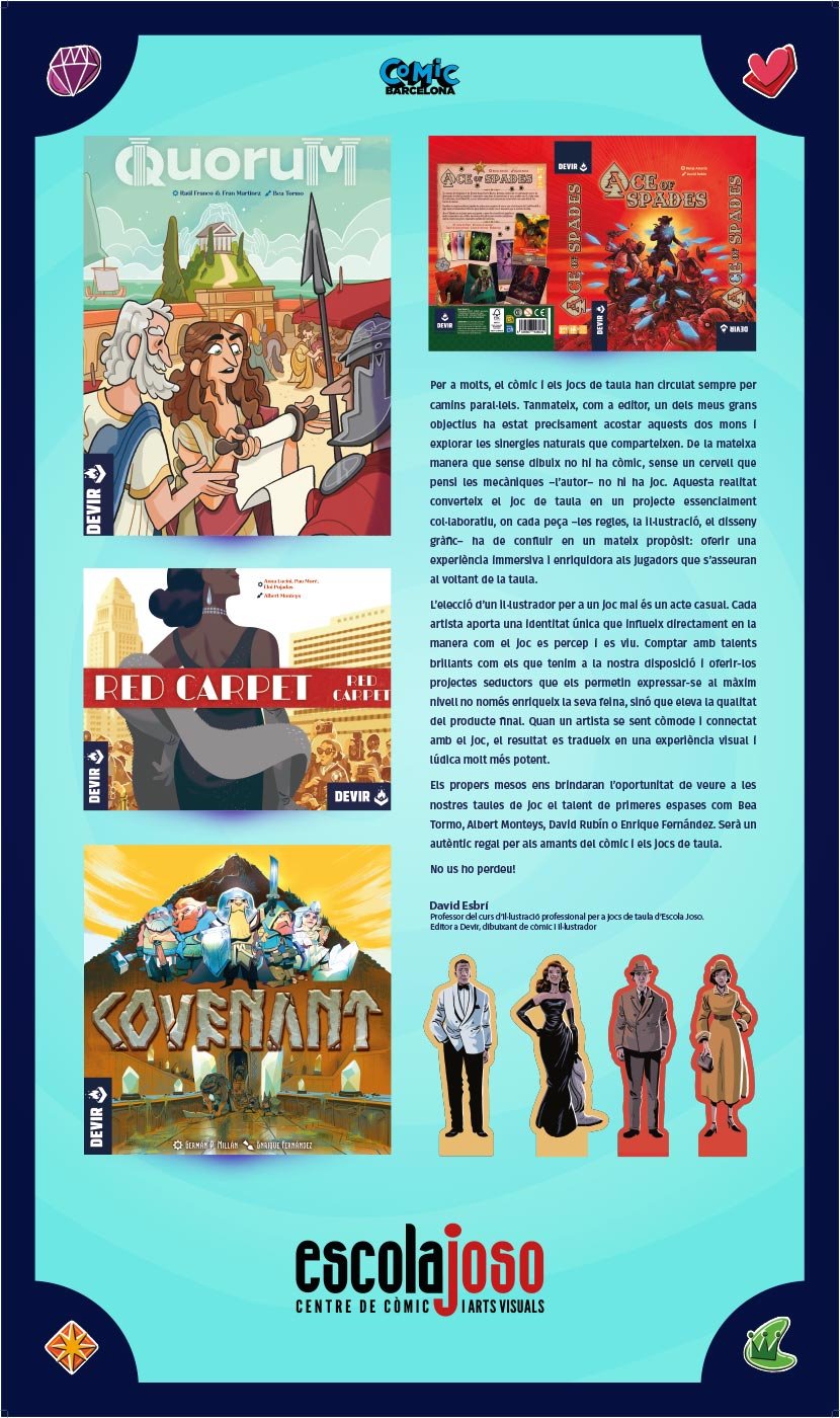La il·lustració per a jocs de taula és una forma de narrativa única dins del món del dibuix. En aquest àmbit, l’art ha d’estar al servei de l’experiència de joc. Els jugadors s’asseuen al voltant de la taula i interactuen constantment amb els components físics: el tauler, les cartes, les fitxes o les llosetes.